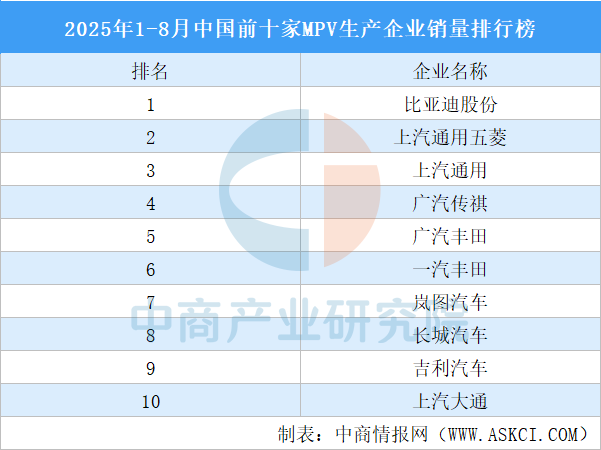 中商情報(bào)網(wǎng)訊:1-8月,銷量排名前十位的MPV生產(chǎn)企業(yè)共銷售59.5萬輛,占MPV銷售總量的77.6%。比亞迪股份銷量超12萬輛位居榜首,上汽通用五菱、上汽通用排名第二和第三,廣汽傳祺、廣汽豐田、一汽豐田、嵐圖汽車、長城汽車、吉利汽車、上汽大通進(jìn)入前十,依次排名第4-10名。