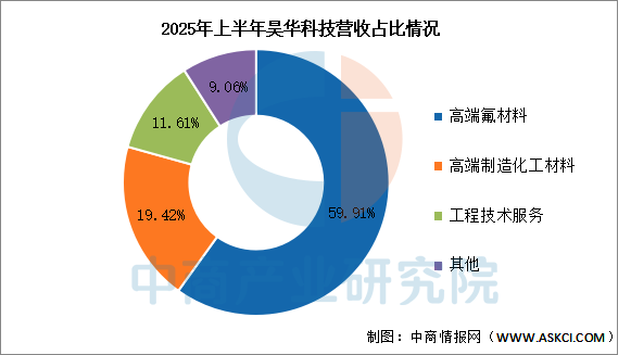 2025年上半年實(shí)現(xiàn)營(yíng)業(yè)收入77.6億元,同比增長(zhǎng)124.34%;實(shí)現(xiàn)歸母凈利潤(rùn)6.45億元,同比增長(zhǎng)74.32%。2025年上半年主營(yíng)產(chǎn)品包括高端氟材料、高端制造化工材料、工程技術(shù)服務(wù),營(yíng)收分別占整體的59.91%、19.42%、11.61%。