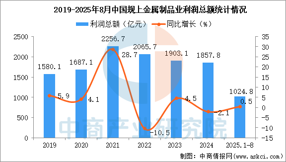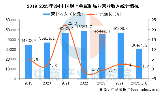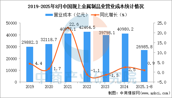 中商情報(bào)網(wǎng)訊:2025年1-8月,全國規(guī)模以上金屬制品業(yè)營業(yè)收入和營業(yè)成本均出現(xiàn)同比增長,利潤總額出現(xiàn)同比增長。