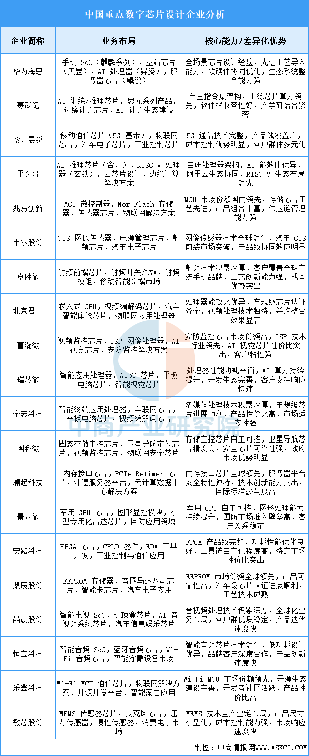 中商情報(bào)網(wǎng)訊:行業(yè)正經(jīng)歷從跟隨仿制向自主創(chuàng)新的關(guān)鍵轉(zhuǎn)型,技術(shù)競爭聚焦先進(jìn)工藝節(jié)點(diǎn)、異構(gòu)計(jì)算架構(gòu)及 Chiplet 先進(jìn)封裝,應(yīng)用領(lǐng)域從消費(fèi)電子向 AI 計(jì)算、智能汽車、高端工業(yè)控制等高價(jià)值場景拓展。華為海思以全場景芯片設(shè)計(jì)能力主導(dǎo)高端市場;寒武紀(jì)借 AI 芯片架構(gòu)創(chuàng)新構(gòu)建技術(shù)壁壘;紫光展銳依托通信芯片全棧方案鞏固市場地位。