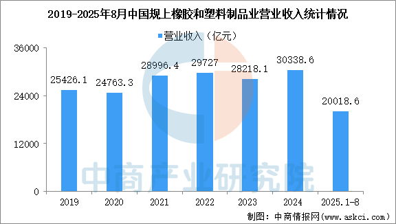 2025年1-8月,全國規(guī)模以上橡膠和塑料制品業(yè)營業(yè)收入20018.6億元,同比增長2.4%;營業(yè)成本16989.3億元,同比增長2.6%;利潤總額985.3億元,同比下降4.6%。