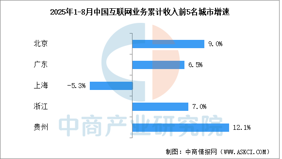 超三成地區(qū)互聯(lián)網業(yè)務收入實現(xiàn)正增長。1—8月份,互聯(lián)網業(yè)務收入居前5名的北京(增長9%)、廣東(增長6.5%)、上海(下降5.3%)、浙江(增長7%)和貴州(增長12.1%)共完成業(yè)務收入10897億元,同比增長5.1%,占全國(扣除跨地區(qū)企業(yè))互聯(lián)網業(yè)務收入的84.7%。