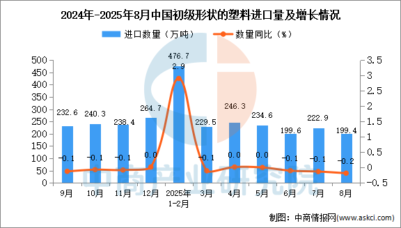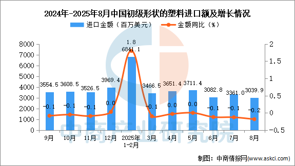 2025年8月中國初級形狀的塑料進(jìn)口量及金額增長情況