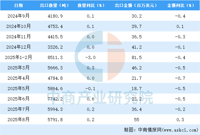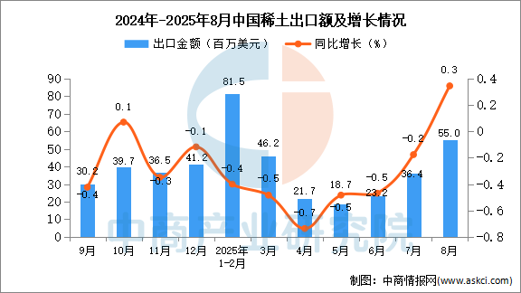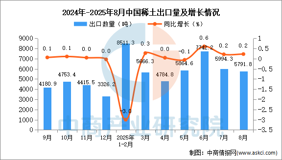 2025年8月中國(guó)稀土出口量及金額增長(zhǎng)情況