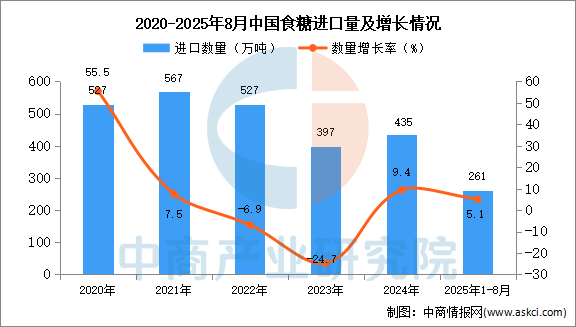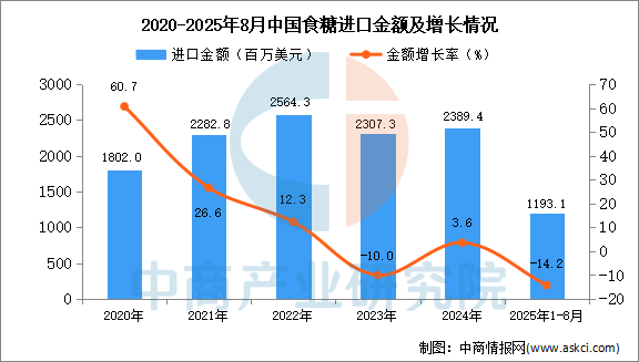 2025年8月中國食糖進(jìn)口量及金額增長情況