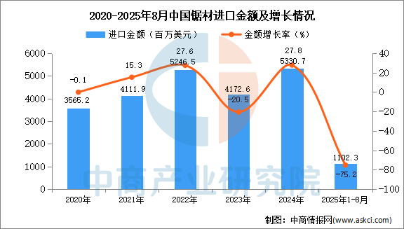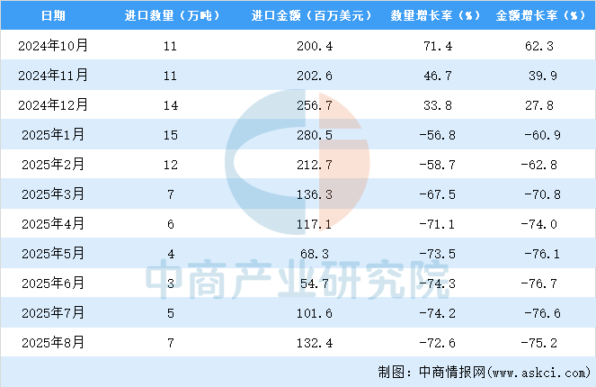 從金額方面來看,數據顯示,2025年1-8月中國棉花進口金額1102.3百萬美元,同比下降75.2%。