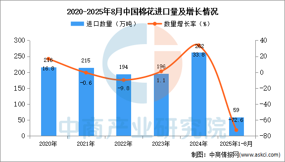 中商情報網訊:據中商產業(yè)研究院數據庫顯示,2024年中國棉花進口量262萬噸,同比增長33.8%。最新數據顯示,2025年1-8月中國棉花進口量59萬噸,同比下降72.6%。